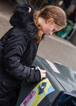 Bei der Präsentation des Autos auf dem Schulhof war das Siegerbild auf dem Auto zu sehen. Diana, die das Bild gemalt hat, durfte dann noch ihr Bild signieren.